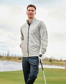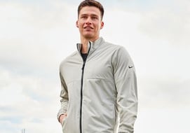 Designed with Storm-FIT technology to shield you from wind and rain, this sporty performance jacket has stretch for movement. Features a zip-through collar, side pockets and elastic cuffs. The contrast heat transfer Swoosh logo is on the left sleeve.