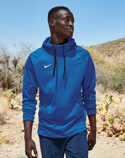 Nike has elevated the classic hoodie by improving this year-round essential with incredibly warm Therma-FIT fabric which breathes and manages moisture. The design includes a three-panel hood, front pouch pocket and open cuffs.