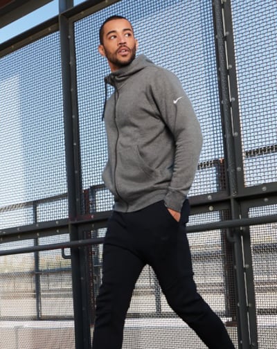 This brushed-back fleece hoodie is where comfort meets street-ready Nike style. Jersey-lined, three-panel hood with dyed-to-match drawcords and zipper. Front pockets. Rib knit cuffs and hem.